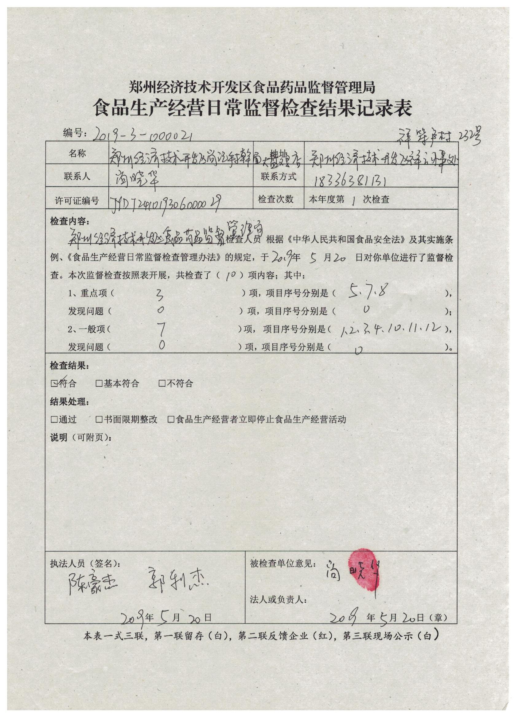 郑州经济技术开发区尚记手擀面大盘鸡店2019年第一次检查