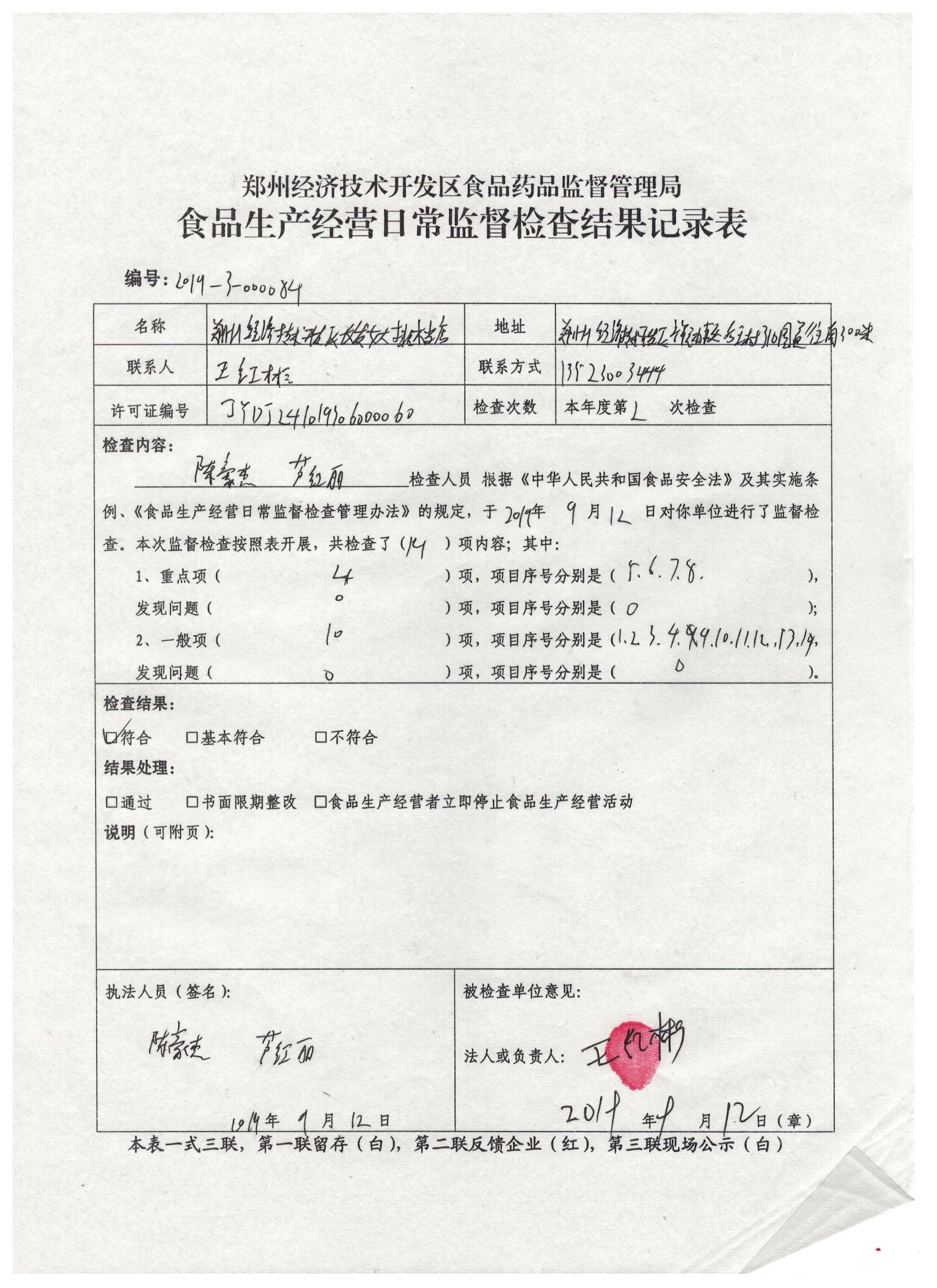 郑州经济技术开发区长发女大排档店2019年第二次检查